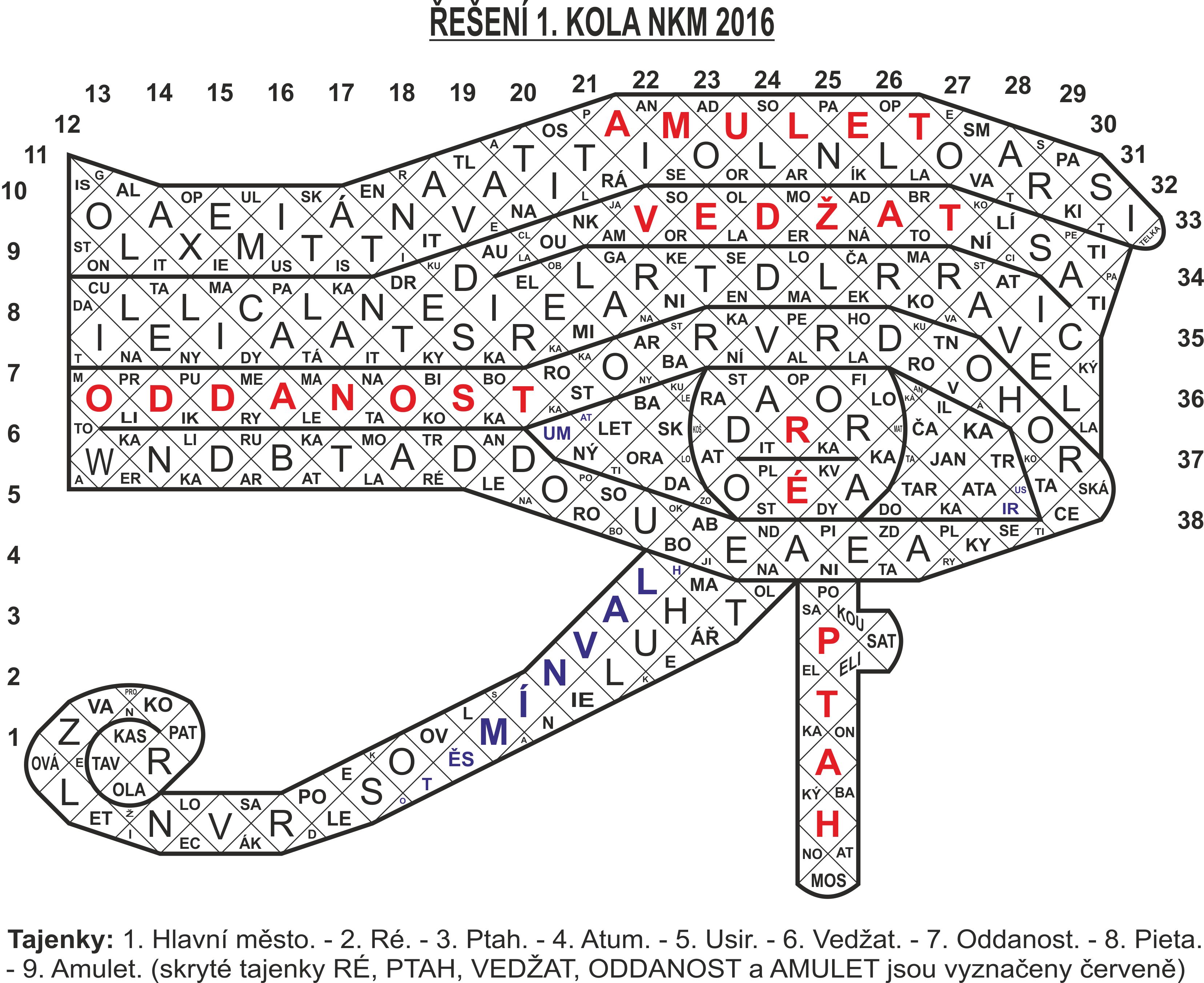Do 1. kola NKM 2016 zaslalo svá řešení 25 účastníků. Vedle autorského řešení založeného na výrazu MARAVELLA (x MAREK x ČARKOVA x LOLEK x LODEN) byla uznána také řešení CARAVELLA (MČSE) x CARDO x BOLDO i KARAVELLA (bylo doloženo, že Velký Otto, h. karavela a loď, uvádí obě pravopisné varianty, čímž je splněn požadavek příslušného současného Výkladu) x KAPÁK (NLA) x BOLÁK (RYST2), nebo KARAVELLA x KARDA (PSJČ) x BOLDA (RYST2). Dále jsem vedle výrazu KAWA (SNČ) akceptoval také výraz JAWA a křižující rostlinu JANKA (NLA), ovšem pouze v kombinaci s výrazy LINER (plavidlo) x LIDAR (NASCS) – rostlina JACKA (v řešení RACER x RADAR) nebyla doložena. Poslední ošemetnou pasáží byly výrazy DAZO (RYST 2) x ZO (Zdeněk Oliverius – ČBS 2/490). Uznávány byly různé varianty obrysu.